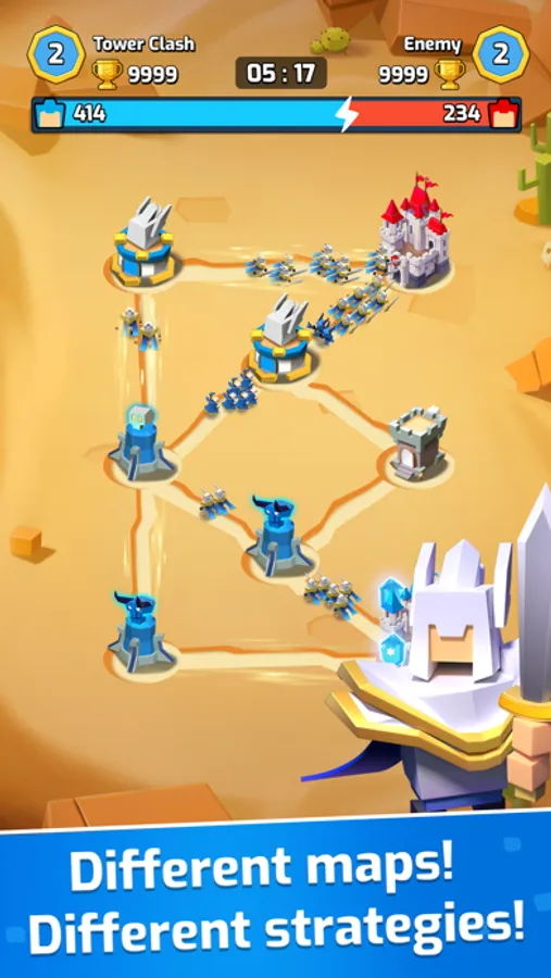 Experience the addicting tower battle! From the creators of Art of War: legions, Tower Clash is a real-time strategy game centered on Troops and Towers. It's easy to get started, and you can continuously improve your battle strategy and the tactic of tower attack timing along with your game journey. In the game, you can increase the Arena Level by competing with other players, and finally compete with the world's best Tower Clash players in the Champion League and fight for your own glory!