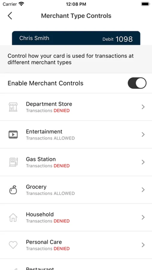 Spending limits can be established to allow transactions up to a certain dollar value and decline transactions when amounts exceed your defined thresholds. Transactions can be monitored and managed for specific merchant categories such as gas stations, department stores, restaurants entertainment, travel, and groceries. And your transactions can also be monitored for specific transaction types: in-store purchases, e-commerce transactions, mail/phone orders and ATM transactions.