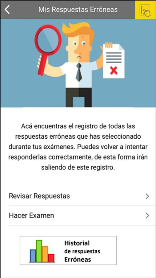 4.- HISTORIAL DE RESPUESTAS: Permite revisar el archivo personal de todas las preguntas buenas y malas, así cada usuario podrá saber en cuál tema debe reforzar su aprendizaje.