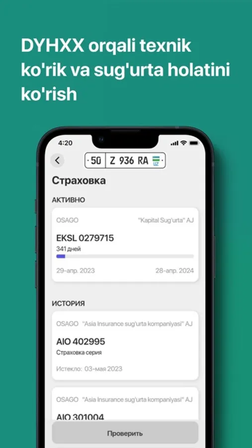 - Avto transportni sug'urta va texnik ko'rik holatini tekshirish (sugurta va texnik ko'rik ma'lumotlari YHXBB bazasidan olinadi)