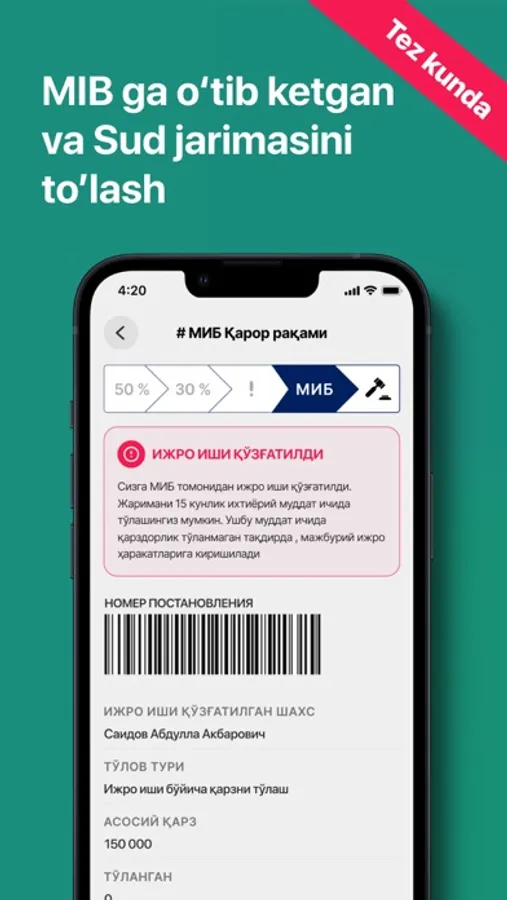 - Jarimaning 50% va 30% lik chegirmalari tugashidan 7-kun oldin va 2-kun oldin habar olish