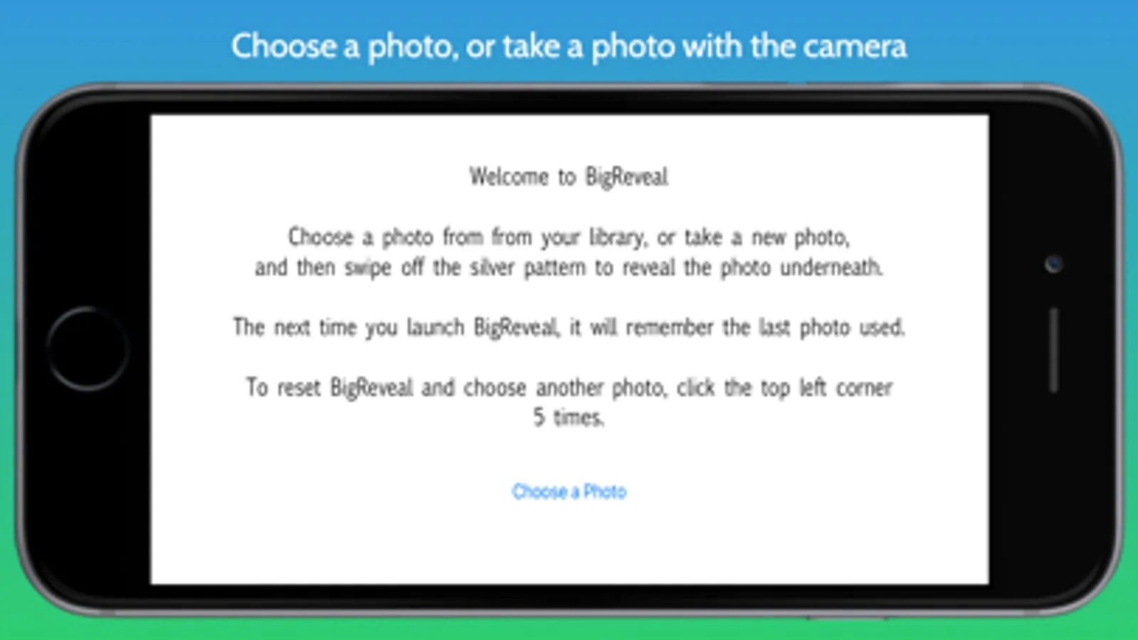 BigReveal is a very simple app that's like a scratch card. You choose a photo from either your photo library, or take a photo with the camera on your device. Then you simply swipe using your finger to remove the silver pattern and reveal the surprise!
