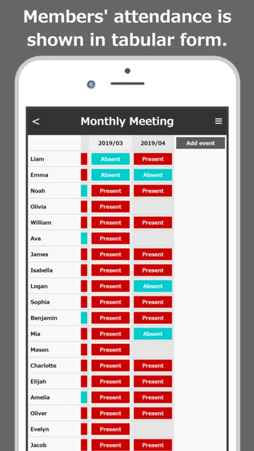 You can manage each event related to the group. By touching a member's name on the screen, the attendance status of that member changes. You can take attendance with just one tap on a member.