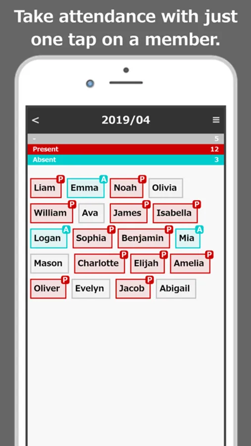 This is an app to manage the members' attendance. You can record and keep track of your members' attendance status ("present" or "absent") with simple operations. This app can be used for a wide range of purposes, including attendance management for meetings, classes, events, money collection, duty assignment, etc.