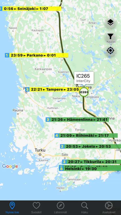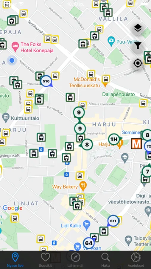 Track Helsinki, Tampere, Turku & Oulu public transportation vehicle location live on map and trains in everywhere in Finland.