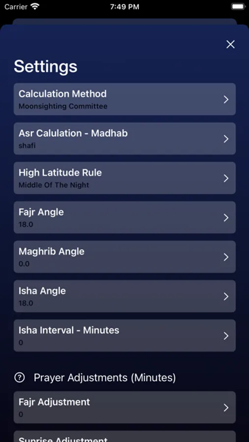 - you can fully customize the prayer times, change the calculation method, adapt the angle, and even adjust the prayers in a very easy way