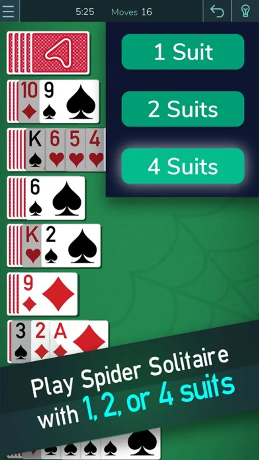 The rules of spider solitaire classic depend on how many suits you choose to play with, and your options are four suits, two suits and one suit.