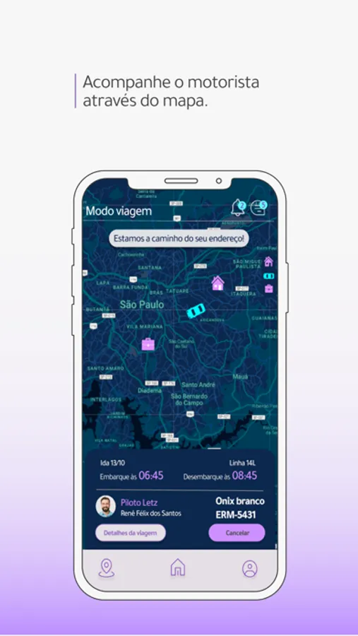 Aqui, você consegue se comunicar com o piloto, acompanhá-lo no mapa, acessar o suporte, controlar sua agenda e muito mais!