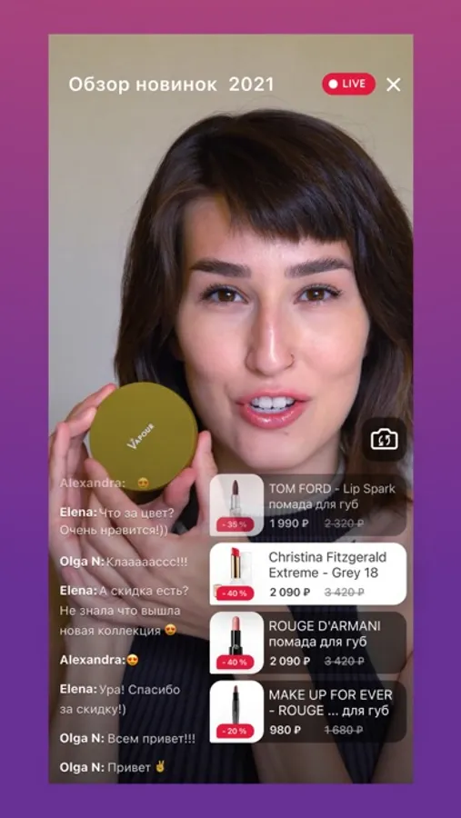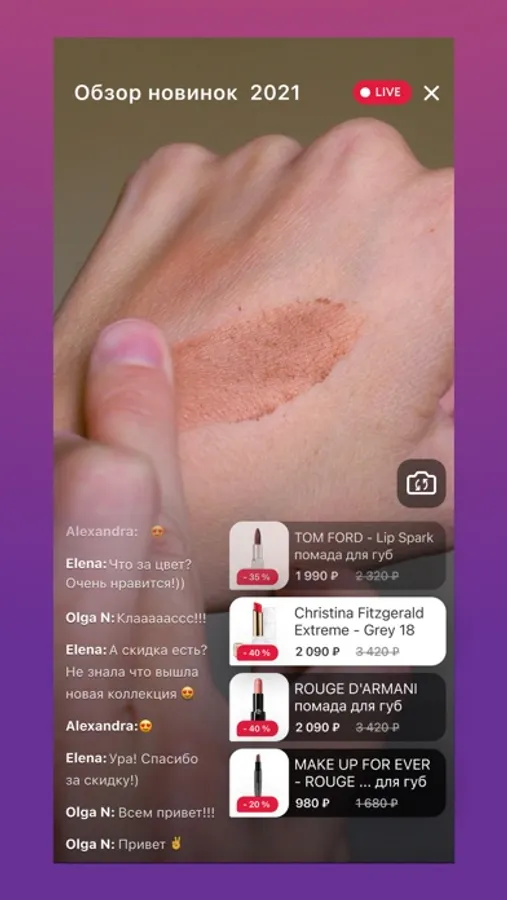 С помощью ShopStory.live интернет магазины могут запустить продажи товаров в видео эфирах прямо у себя на сайте. Прямые трансляции Live Commerce позволяют взаимодействовать с покупателями в режиме реального времени, отвечать на их вопросы и комментарии по товару.