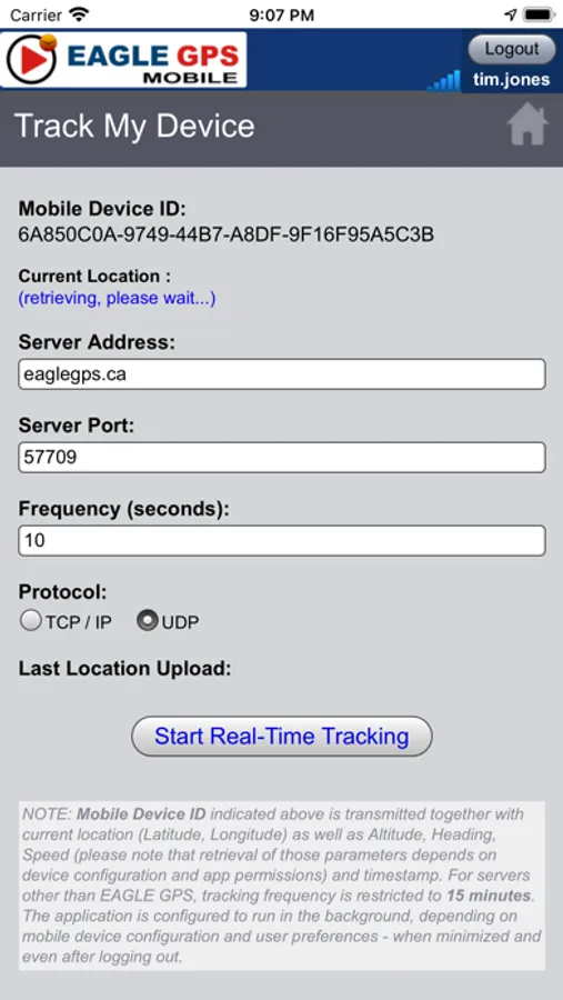 Eagle GPS is an asset tracking platform relying on wireless communication between GPS devices attached to an asset (e.g. car/truck/bicycle/container/etc.), therefore moving together. Eagle GPS Mobile app allows viewing those tracked assets (devices) as well in real-time on map, send commands to them (if applicable, depending on device type) and view historical data (breadcrumbs). It also facilitates the integration of mobile devices (cell phones, tablets, etc.) with Eagle GPS asset tracking platform (therefore acting as a virtual GPS tracking device), transmitting to the server (as configured through the app) the following: mobile device identifier (detected automatically), user ID, latitude, longitude, altitude, heading, speed (subject to mobile device capabilities, configuration and user permissions) and timestamp (UTC). That data is sent out only when initiated by user and the user can stop that transmission anytime, either by pressing a button or by terminating the app. Depending on device and user permissions, the transmission may continue in the background, when the application is hidden or minimized, even after logging out (a user name and password are required to use the application).