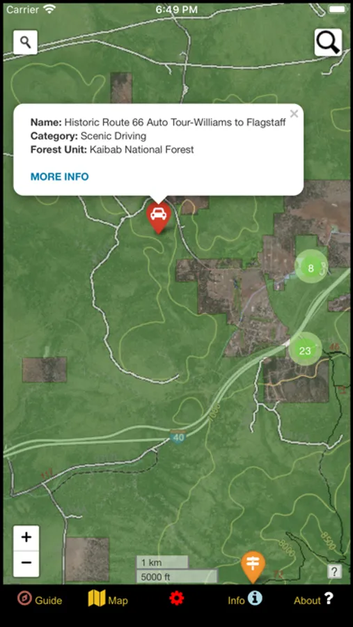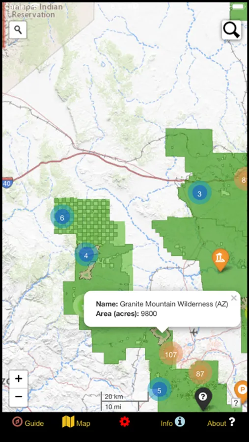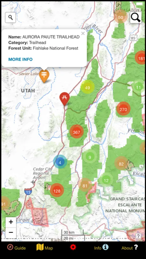 On the Map screen, there are a series of circle clusters at distant zooms that indicate how many points are within a given cluster. As you tap the clusters to zoom in, individual points and icons become visible, along with trails, roads, and boundaries. These features can be clicked on to reveal the name, location, and other useful information. The map screen also has two search tools - the left one can be used to look up addresses and towns, while the right one will allow you to query the names of the features in the database.