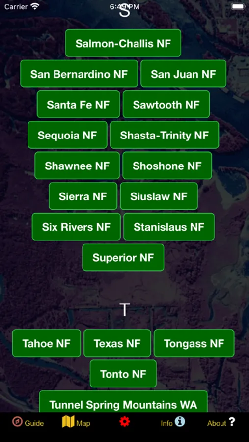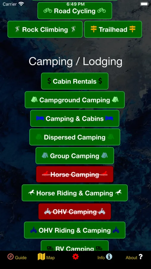 Once using the app, there are five screens. The Guide screen will provide data legends as well as helpful tips for optimizing your navigational experience. On the Info screen, you will find a number of spatial links to the different Forest Service forests, grasslands, and wildernesses. This is a great way to quickly locate specific places and discover new places to explore! The About screen provides links to all of the open-source resources used in the app and gives a little information about the developer GeoPOI. The Map Settings screen is where you can change between one of four different basemaps, download offline imagery, turn on geolocation, and toggle specific point categories. Finally, the Map screen is where it all comes together!