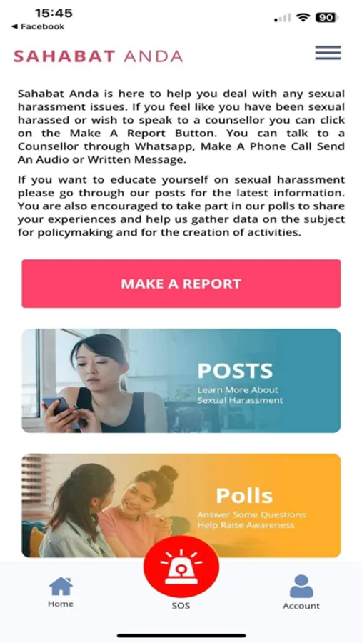 Sahabat Anda is a sexual harassment reporting app for local and migrant workers in Malaysia. The app is published by NGO Persatuan Sahabat Wanita Selangor (Sahabat Wanita), that works with women workers in various aspects, from counselling, training, educating and empowering them for improved quality of life.