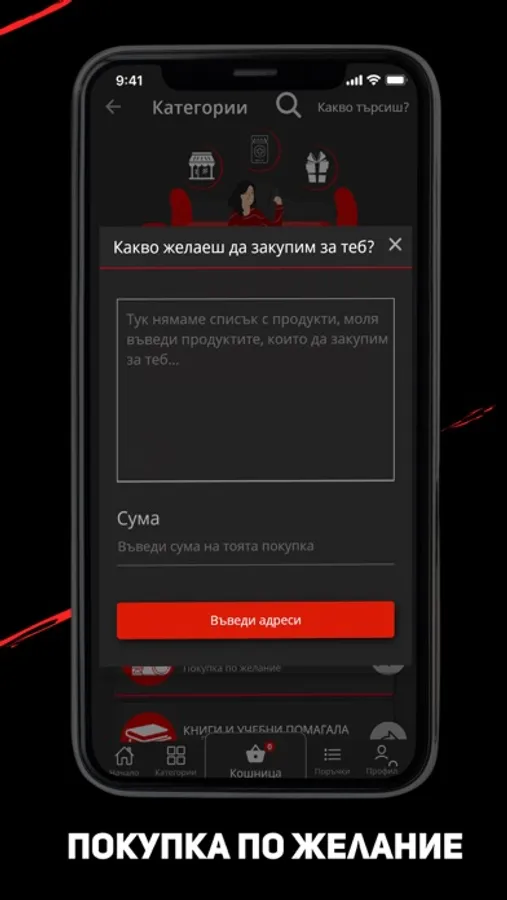 Избери града, в който се намираш, разгледай магазините и продуктите им. Ако желаният от теб продукт не е наличен, може да направиш "Покупка по желание". При нея куриера ще отиде до желан от теб магазин и ще купи продукта, който желаеш и ще ти го достави.