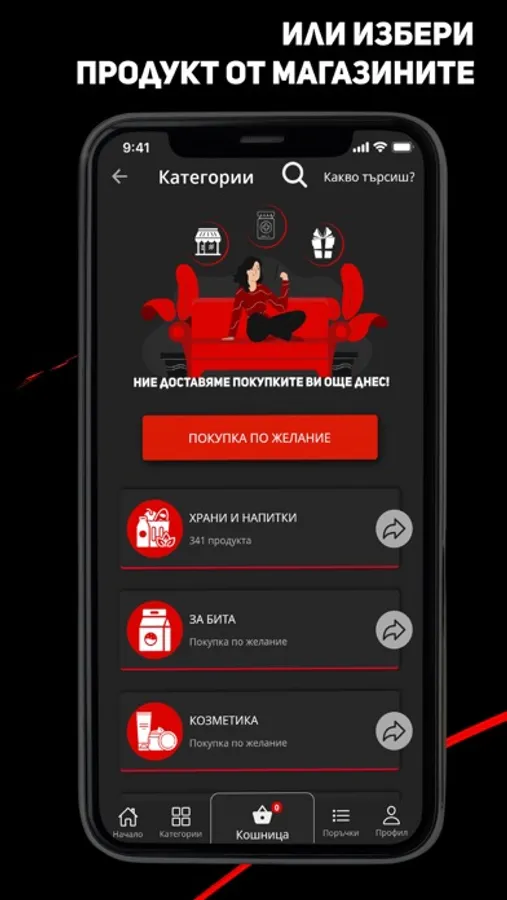 Позволява да поръчаш всичко което искаш и то ще ти бъде доставено още днес! Може да поръчаш от всички магазини, без значение колко са отдалечени са те. Всички магазини в приложението са с доставка до всички точни на града.