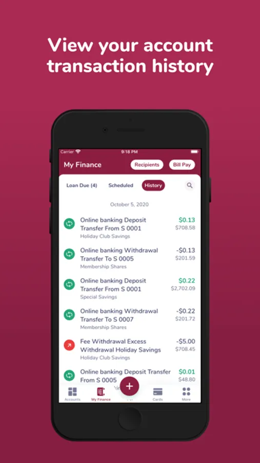 The SIU CU Mobile Banking App enables users to check balances, view transaction history, deposit checks, transfer funds, pay bills and check messages from a smartphone or tablet.