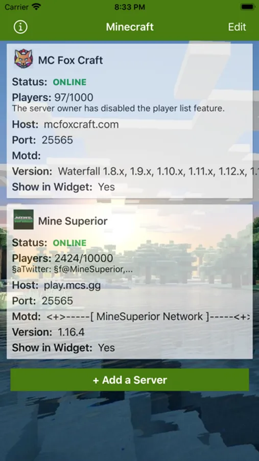 This app is for anyone who plays on a Minecraft server. Add any server to the app and see useful information about it including: Online Status, Number of players online, List of players who are online, Host, Port, Message of the day, Server Version,...