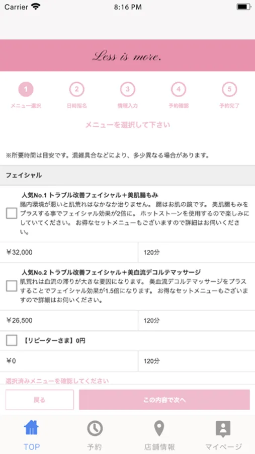 予約状況の確認やキャンセルがマイページ上から行えます。スタッフの登録が出来るので前もって担当者を登録しておけばマイページからスムーズな指名予約が可能です。
