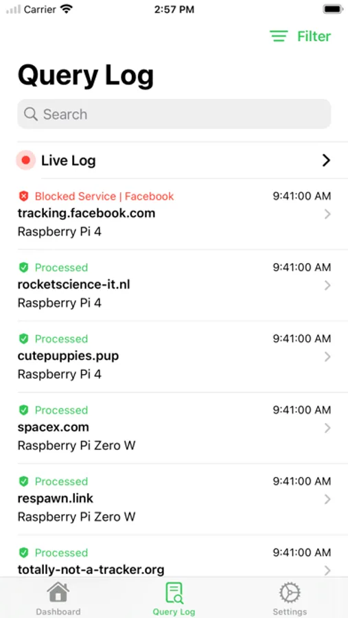 - Live Log showing a log of queries while they happen in real-time (requires Pro)