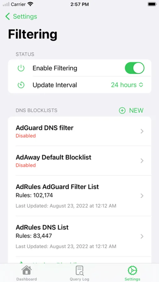 Add or edit your clients, add some new filters or maybe disable them for a while, update your filters, edit blocked services, manage DHCP and DNS settings, create new DNS rules, or edit your Query Log settings.