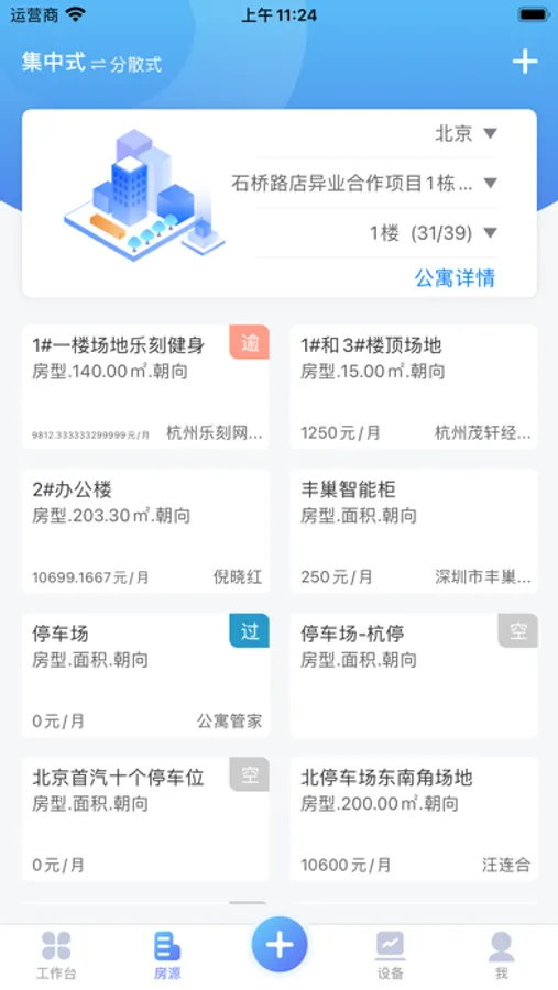 1:房源管理,直观可视的方式展示房间房号、数量、出租情况、合同状态等,运营人员可直接对房间进行操作,到期和空置情况一目了然。运营人员可对公寓、房间进行新增、编辑、删除、查找操作。