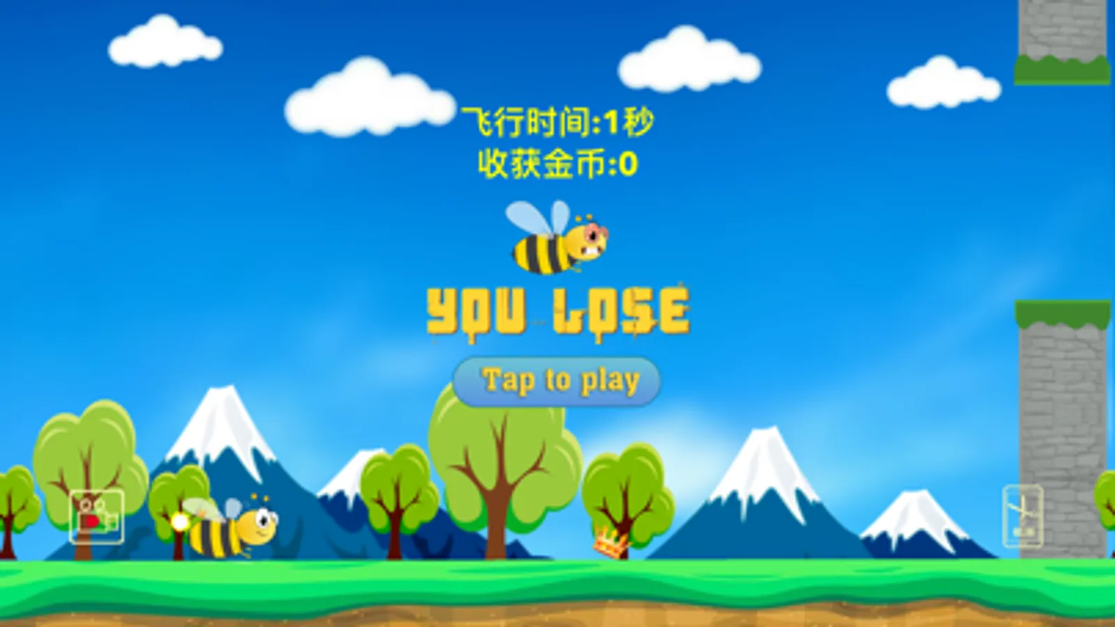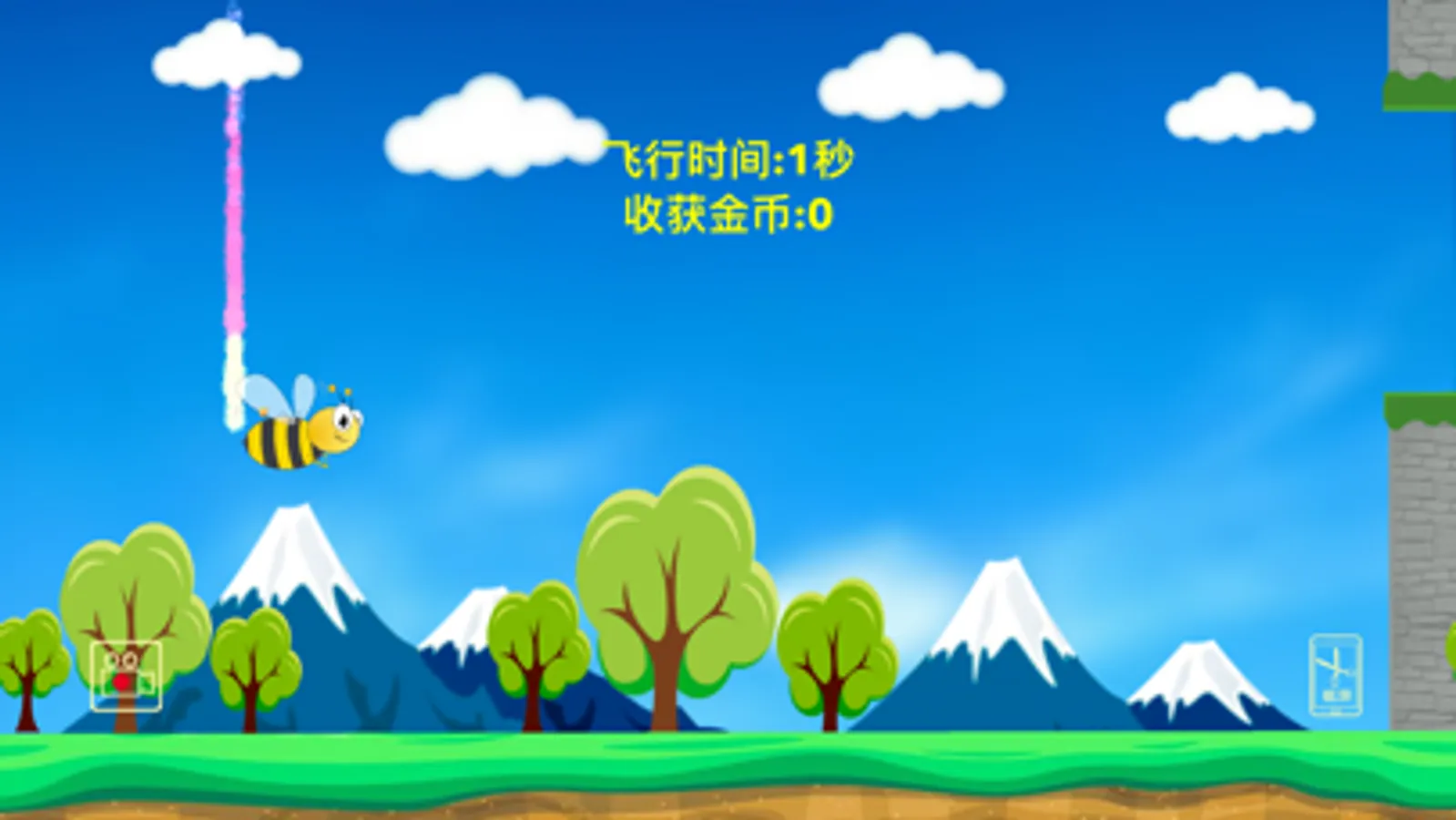 4.游戏玩法,点击开始按钮开始游戏,游戏途中可通过点击屏幕任意位置/向前方倾斜手机来实现小蜜蜂的飞行,躲避障碍物等动作