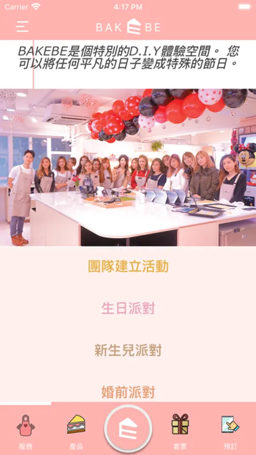 BAKEBE (焙著你烘焙有限公司)是全港唯一用App教學的共享烘焙店,打破傳統的無人教學模式,提供一站式烘焙和派對服務,位於灣仔金鐘商業大廈近二千呎的店舖內已有齊食譜內所需食材和工具,客人只需來到店鋪,跟著BAKEBE APP ( 一人一部IPAD) 從零開始自學製作,需要時有蛋糕達人協助,入場後亦可免費暢飲咖啡茶水和有專人幫您洗碗和包裝。