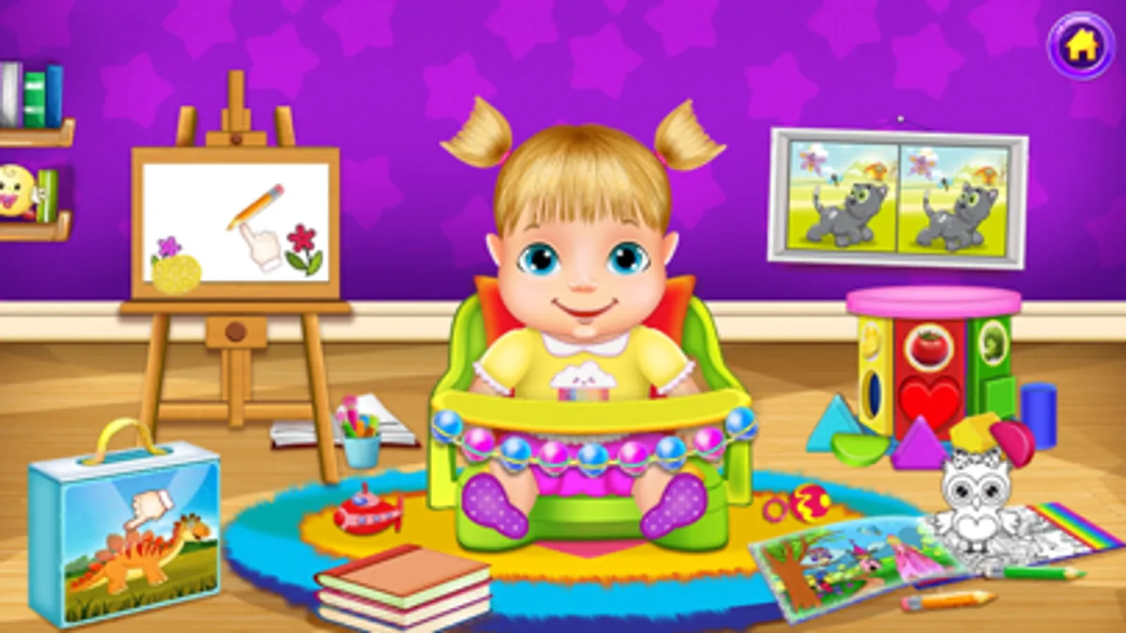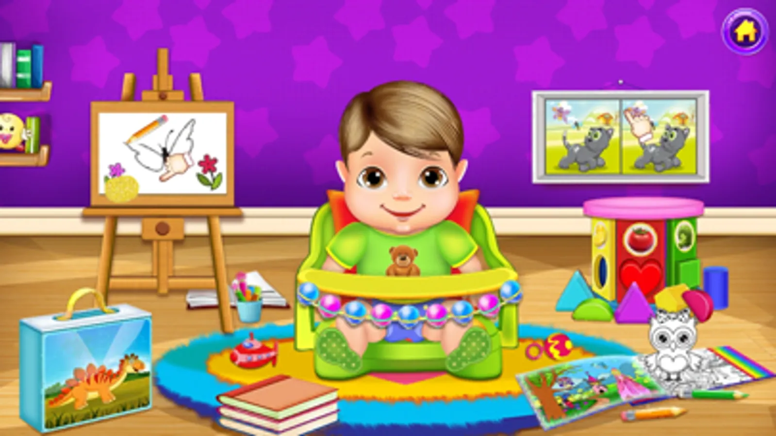 Get ready for some educational stuff! Come to the art room and see! Here we can play puzzle games, color in the beautiful coloring book, draw and paint like real artists and learn while playing in the happy nursery baby care. **Welcome Baby** is the best place to have fun the whole day!