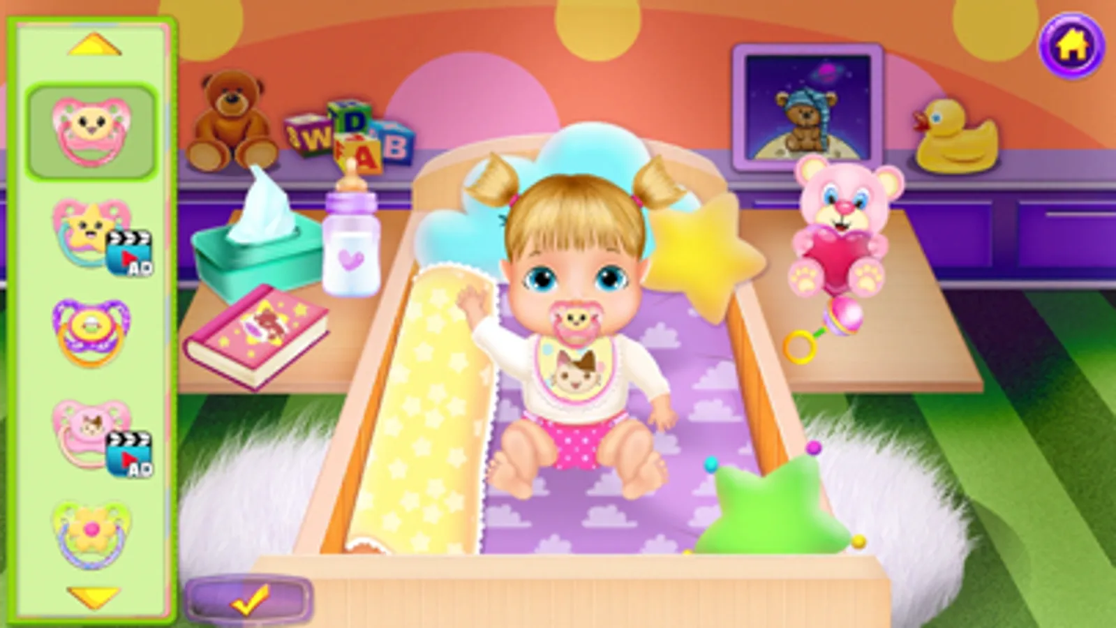 The babysitting mania is not over when these little babies get tired. Now you need to put them to sleep. Put your girl or a boy in the baby crib. Then prepare his or hers toys, a pacifier, a bottle of milk, bedtime stories and a lot of patience. Look, your playful baby is finally asleep! You did a great job, well done!