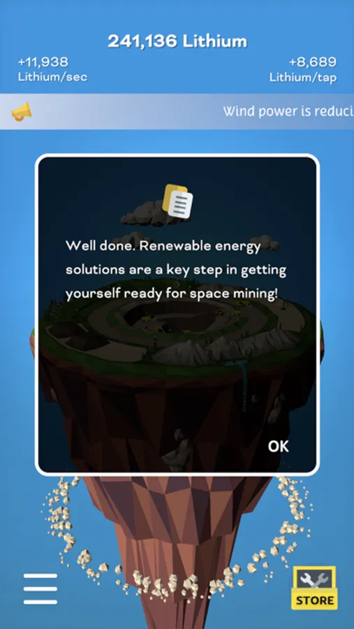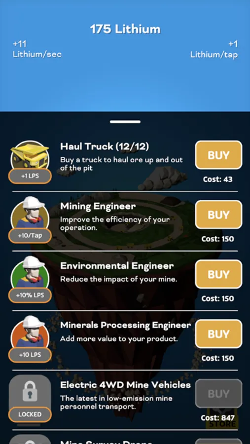 Become the boss of MineTech Island, a floating Lithium deposit ready for you to mine. As you extract Lithium you can use it to buy equipment, upgrade your technology, and employ specialist engineers. Making purchases will increase the productivity of your operation, by extracting Lithium autonomously and improving your personal mining efficiency. Progressing through the store will help you learn about cutting-edge innovations in the mining industry that are enabling more sustainable mining operations. Throughout the journey you will have the opportunity to invest in research with UNSW to improve technologies and partner with NASA to begin your space mining career. The goal is to gain enough experience, technology and resources to launch your own colony rocket to Mars. See who can get there the fastest!