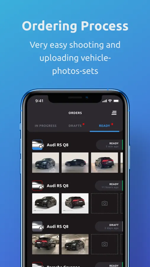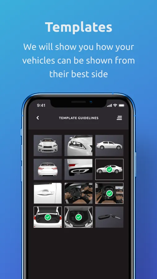 GAD Car Photo App has intuitive interface and easy to follow workflow that supports you throughout the whole process of making and processing photos to yield the immediate results. Such features as guidelines, levels, and skeletons help you find the best angle and position when taking photos while AI technology takes care of photos processing. The AI processes images by cutting out the vehicle from original photo and pasting it on the preselected background; this helps you avoid manual work and saves time.