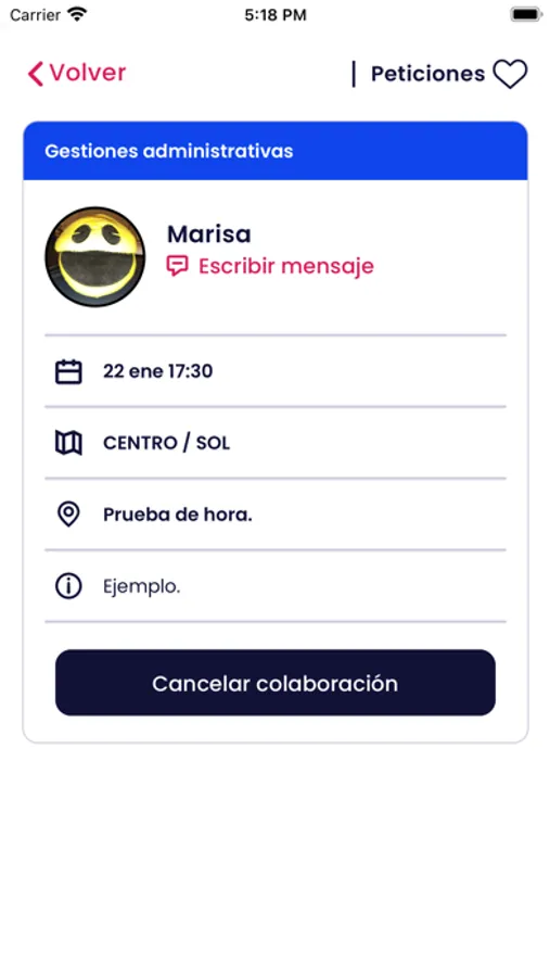 Cliqueando se accederá a cada demanda concreta en la que figurará día, hora, distrito e id de contacto Y un botón de acepto que, cuando se pulse, dirigirá a un chat privado con la persona demandante para concretar detalles, en su caso.