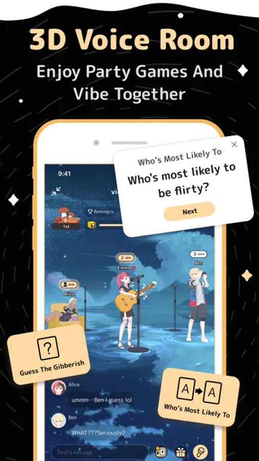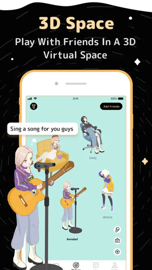 You can post the real-you and no need to worry about any judgement. Also, you can choose different 3D Avatars, invite your friends to the 3D Voiceroom to play party games, and talk with the super understanding AI friend about your feelings or anything.