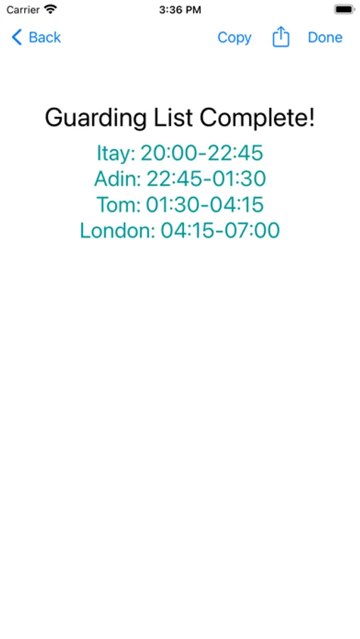 Never hand-type a guarding list again! Guarding List is the perfect app for soldiers and defense force members looking to manage their guarding shifts. Easily select your start time, end time, and names of the participants - and with one button copy or share the list!