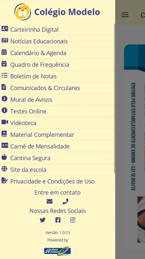 Este é o aplicativo do COLÉGIO MODELO que é mantido pelo Colégio 24 Horas e que proporciona uma série de serviços e funcionalidades para os alunos e para a comunidade escolar.