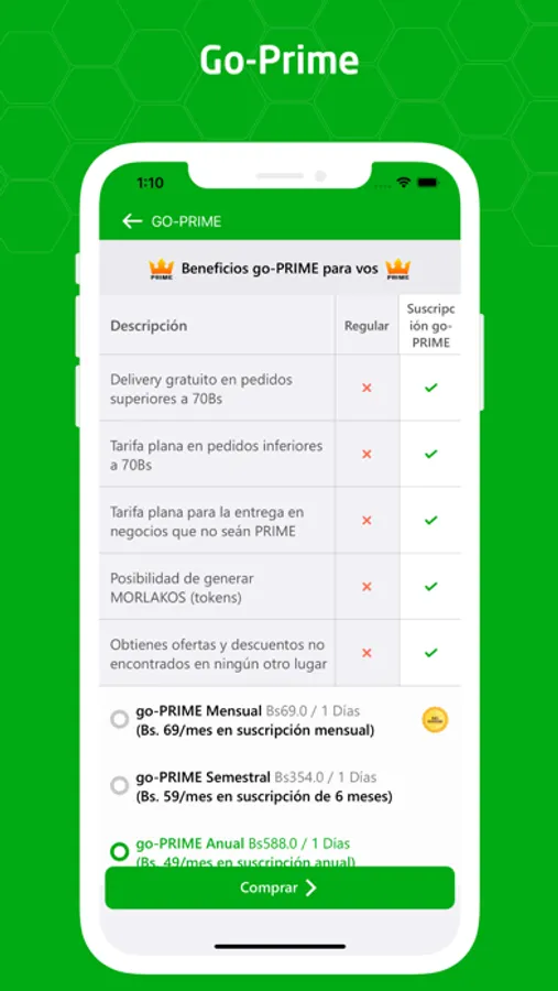 • go-PRIME: El primer servicio de suscripción de membresía en Bolivia que te otorga muchos beneficios como: delivery gratis ilimitado, recibir MORLAKOS (tokens = dinero), ofertas no encontradas en otro lugar, etc
