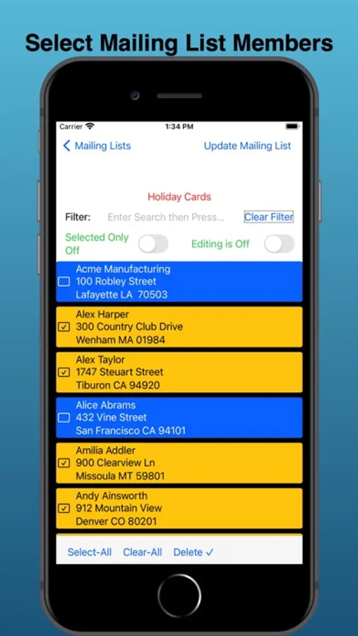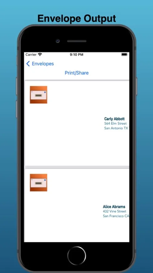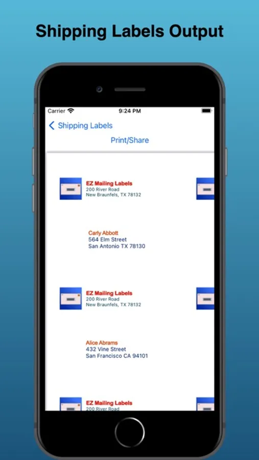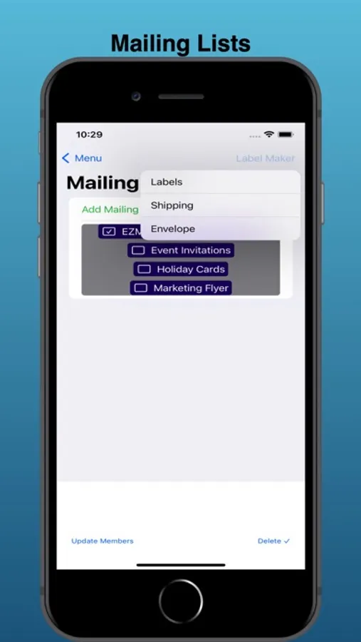 Create mailing labels, shipping labels or envelopes by downloading your contacts, uploading a comma separated values (CSV) file from a spreadsheet or manually typing them. Organize groups of addresses in Mailing Lists. In the future you can go directly from the mailing list to the label maker. Select the label or envelope size (U.S. and European sizes and address formats are supported) and make the PDF document. This document can be printed to adhesive labels or envelopes. An image or logo can be included in the return address of shipping labels and envelopes.