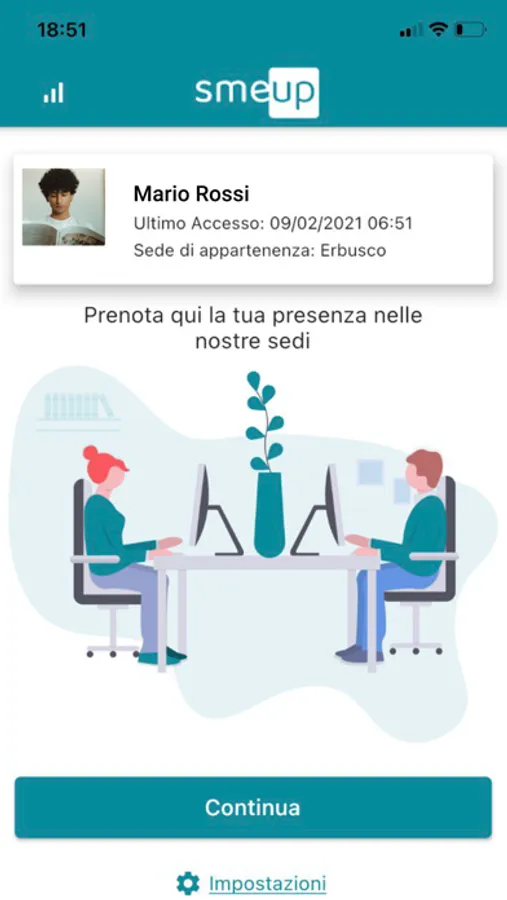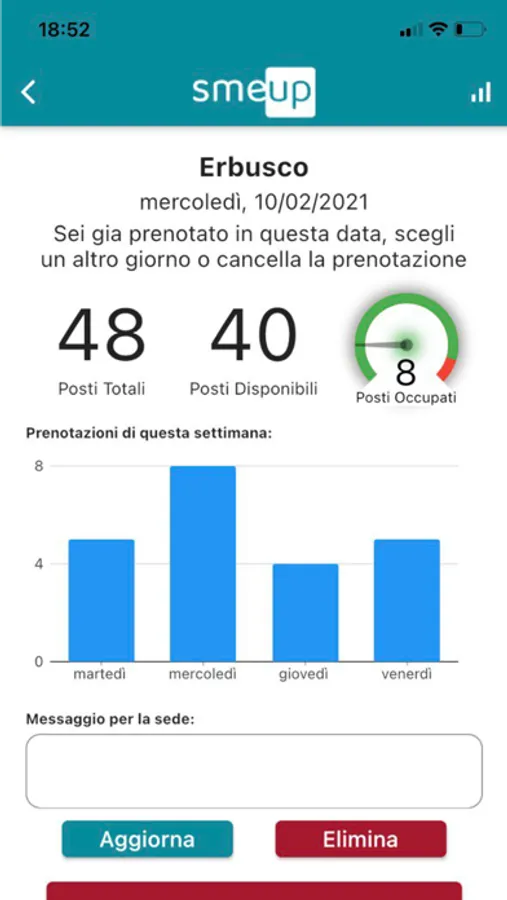 L'app permette di comunicare un messaggio alla sede, verificare il numero dei posti disponibili per una giornata e la lista dei colleghi che hanno già effettuato una prenotazione.