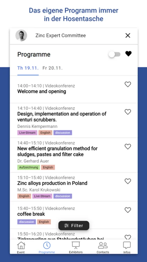 Unsere App bietet Ihnen hierfür ein vielseitiges Event-Tool: Sie können den Besuch von Veranstaltungen individuell planen, erhalten alle Informationen und Hintergrundmaterialien, können sich mit anderen Teilnehmern und den Vortragenden austauschen, an Abstimmungen teilnehmen und uns Feedback geben.