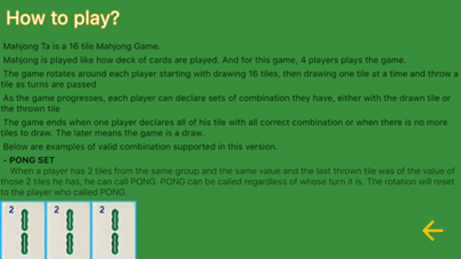 Mahjong Ta is typical 16-tile Mahjong Game with Solo Game, Fun Game, and Multiplayer modes. You start by learning the game and earning trophies until it is enough play against other users online. Solo and Fun games allows players to strategise and learn the game early on by playing against smart BOTS.