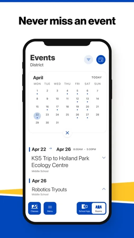 The event section shows a list of events throughout the district. Users can add an event to your calendar to share the event with friends and family with one tap.
