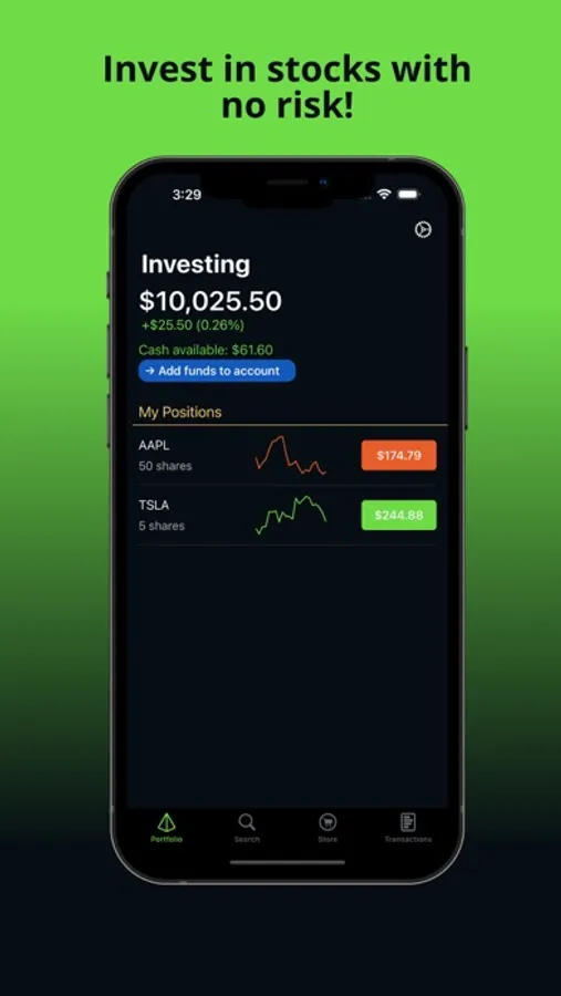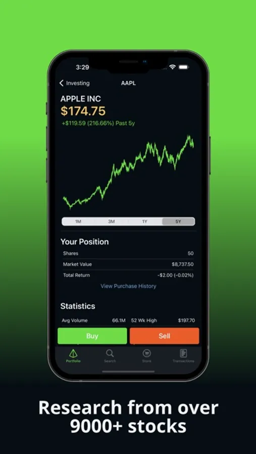 All new users start out with $10,000 and have the option to buy and sell from over 9000+ Stocks, ETFs, etc.