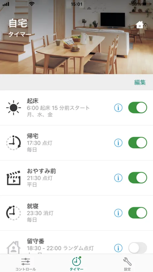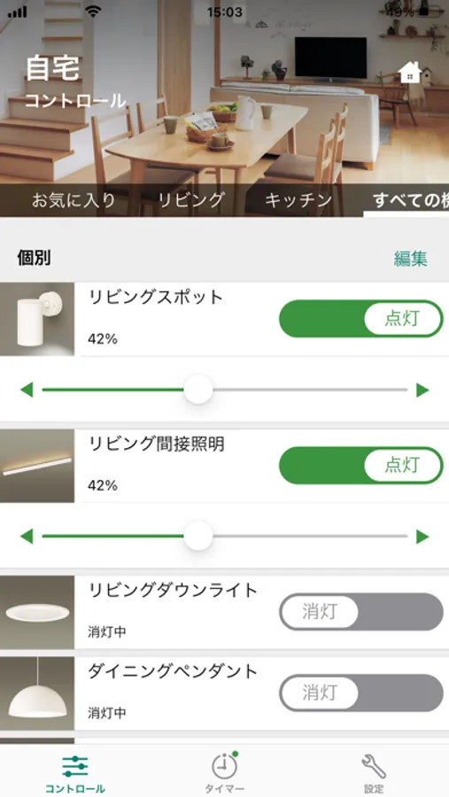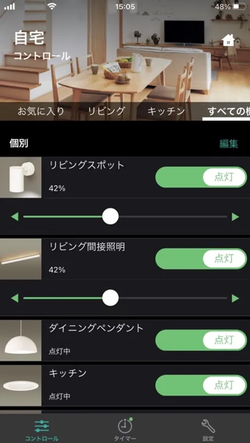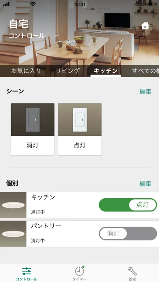 アプリに施工設定されたスイッチを登録すると、スマートフォンから照明の制御が可能となり、個別制御、グループ制御、シーン制御、タイマー設定ができます。