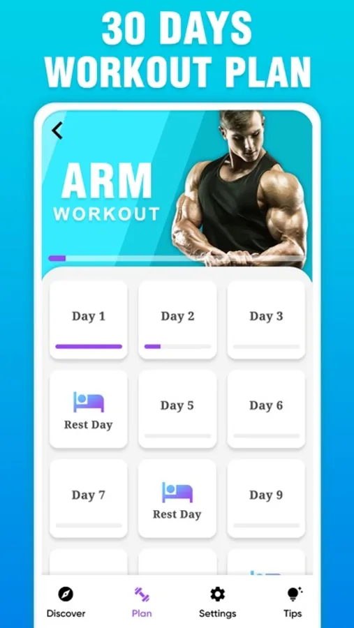 Select your workout plan. This 30-days arm workout at the home app is a collection of workout plans like a weekly workout plans, Month workout plans for all levels, easy, medium, hard, and this home workouts for arms app includes a full arm workout routine.