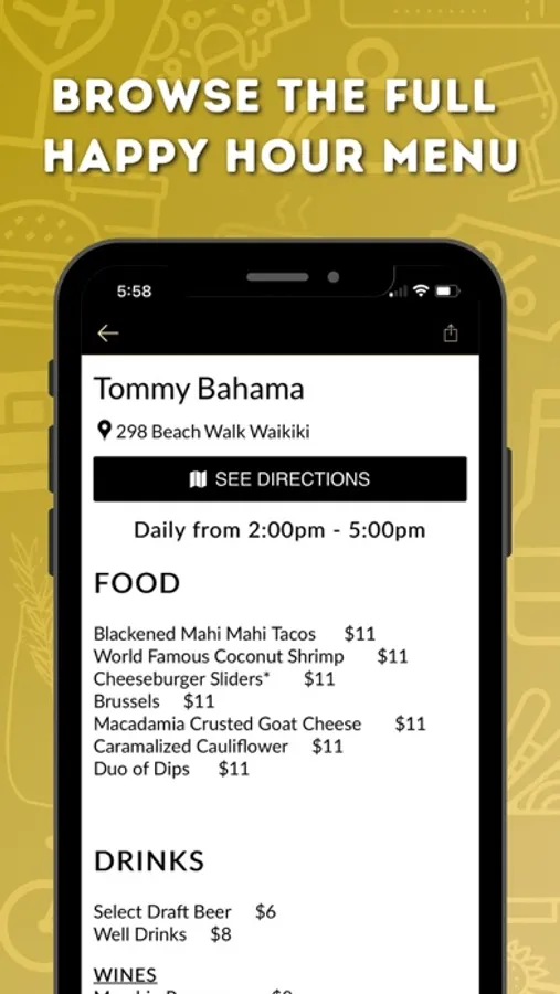 4) Click on a business of your choice to view their full happy hour menu, get directions, visit their website, or even give them a call!