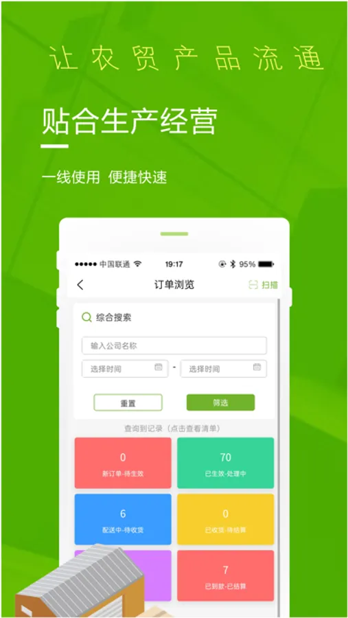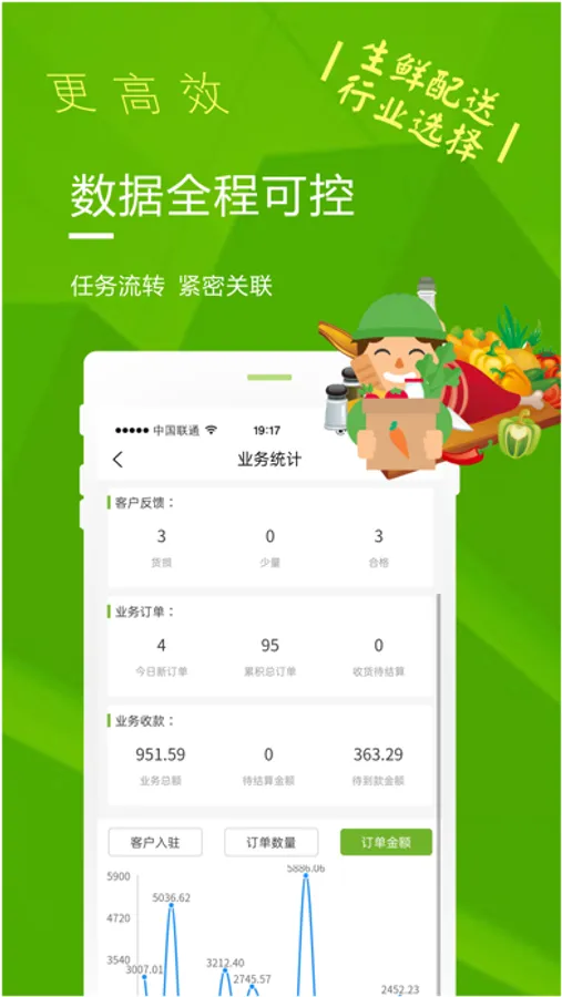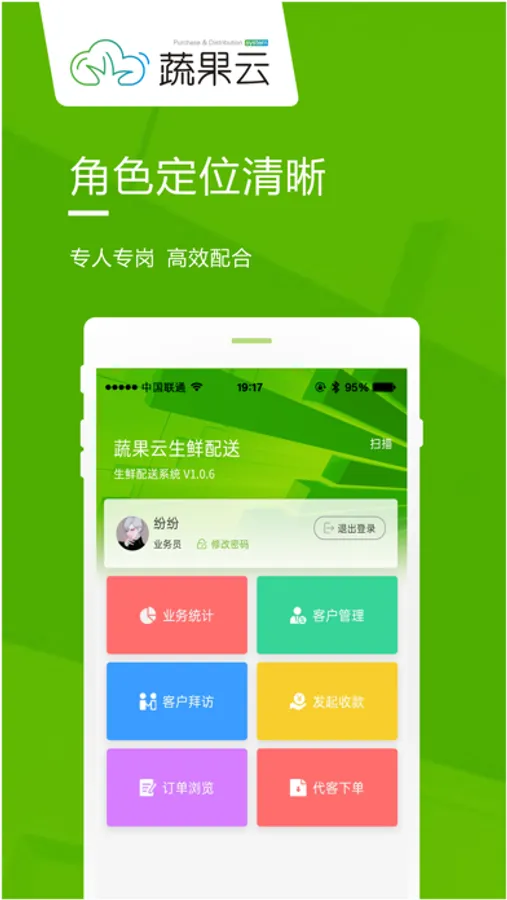 各配送公司的岗位人员凭账号登录,加载显示各自负责岗位工作,能过移动端版本,业务人员可进行客户管理与维护、业务订单跟进、业务收款;采购人员可进行原材采购任务推进、原材采购价格调整;送货人员可以进行订单货品出库清点、订单配送任务推进等。各岗位分工明确,数据清晰,操作简易。