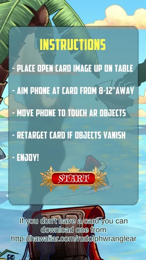 The companion app for HawaiiAR's Holiday card collection. This app only works in conjunction with a HawaiiAR Christmas card. Download the app, lay the card image side up on a flat surface, point your phone at the card and let the fun begin. A demo image can be downloaded from www.hawaiiAR.com/RudolphWrangleAR