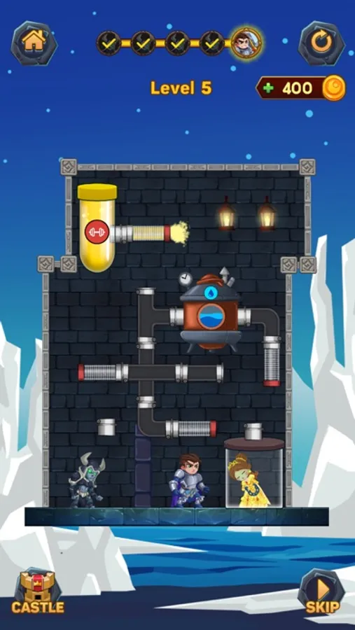 The hero began his journey for treasure and to save the princess, but the puzzles in front of the hunter trapped him. What you need to do is to connect the pipes in the right order, so that the hero can take the hidden treasure and save the princess away from the dragons, wolves and monsters safely.