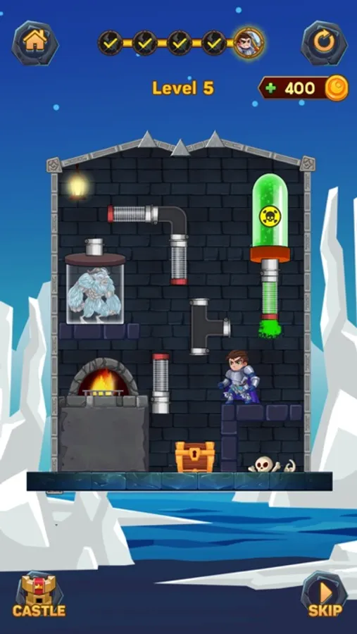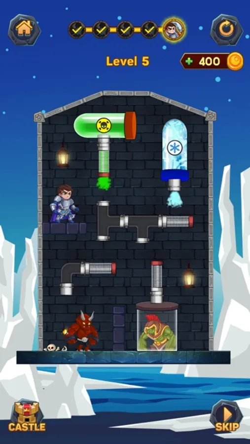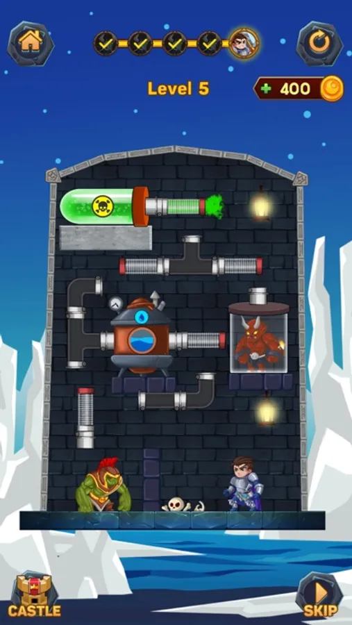 Solve puzzles and rescue the hero, collect all the treasures, kill monsters and save the princess. Connect the pipes in order to destroy your enemies by pulling lava and poisonous gas into their puzzle units.