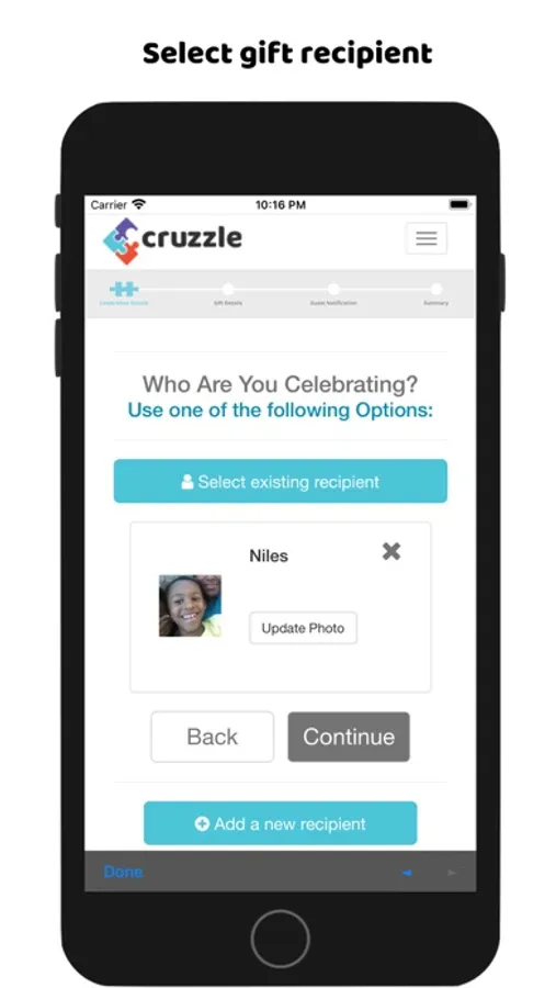 Give: Once the Cruzzle ends, the organizer presents the gift to the recipient, along with a full list of contributors and any messages they may have written or recorded.